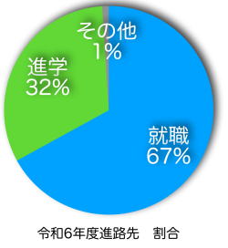1年生時から資格取得・インターンシップ等に取り組み、技能の向上と職業観の育成に努め、希望する企業への就職を実現しています。職種としては、製造業の技術・技能職が多いですが、研究開発職や営業職等もあります。毎年、90%以上の生徒が、第1希望の就職先に内定を得ています。また、就職だけでなく、大学への進学にも対応しており、近年では国公立大学にも進学しています。